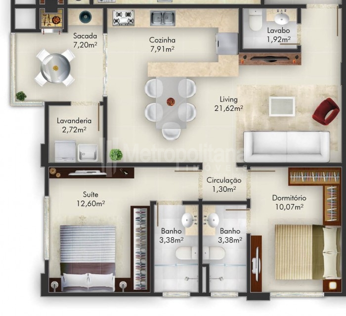 Apartamentos de 02 dormitórios sendo 01 suite.
