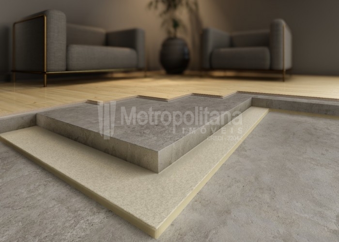 * Manta acústica Com o uso da manta acústica se desfaz a ligação direta da estrutura com o contrapiso, tornando-o flutuante, criando uma barreira à transmissão de ruídos causados por impacto e vibrações no piso entre os pavimentos.