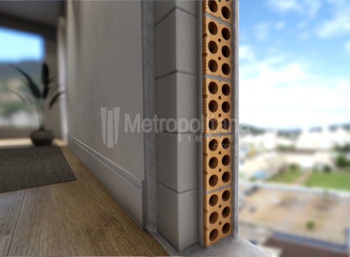 * Parede dupla As paredes na face oeste das suítes são construídas em camada dupla, composta por tijolo cerâmico e bloco de concreto celular autoclavado. Sua tecnologia garante elevado isolamento térmico, inibindo a transferência da temperatura externa para o interior do ambiente.