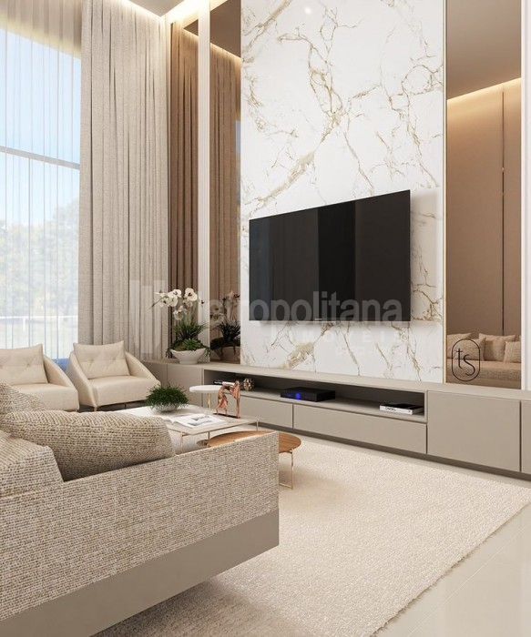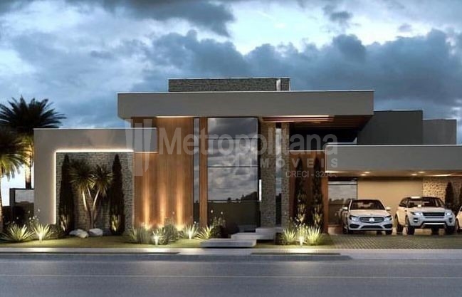 COM REVESTIMENTOS NA FACHADA, JARDIM, ESCADA FRONTAL, ENTRADA DE VEÍCULOS REVESTIDA, PORTÃO DE ENRROLAR NA COR PRETA, PORTA PRINCIPAL EM ALUMÍNIO COM PUCHADOR, JANELAS FRONTAIS ATÉ O TETO EM ALUMÍNIO E VIDROS ESPELHADOS