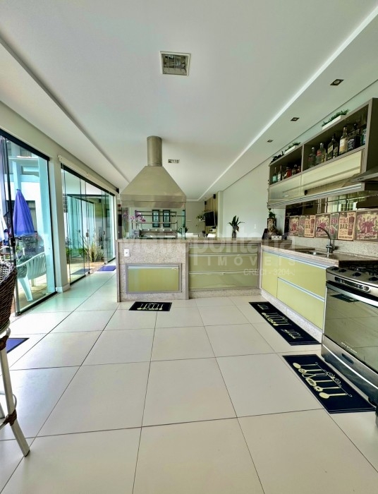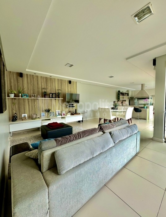 Área de festas em living integrado com sala de estar/TV, sala de jantar e cozinha gourmet.