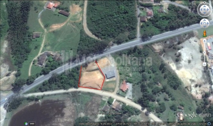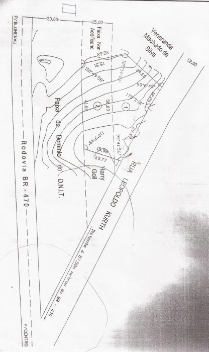 Terreno com área de 1.500,00m2 (frente 43,22 metros com faixa do D.N.I.T, da Br 470 - próximo do posto da policia federal - fundos 41,69 metros - lado 48,56 metros - lado esquerdo 19,34 metros), pronto para construir acesso pela rua que também passa nos fundos do terreno ( área Útil 767,76m2 e Área Non Aedificandi 732,24me - Área Total 1.500,00m2.